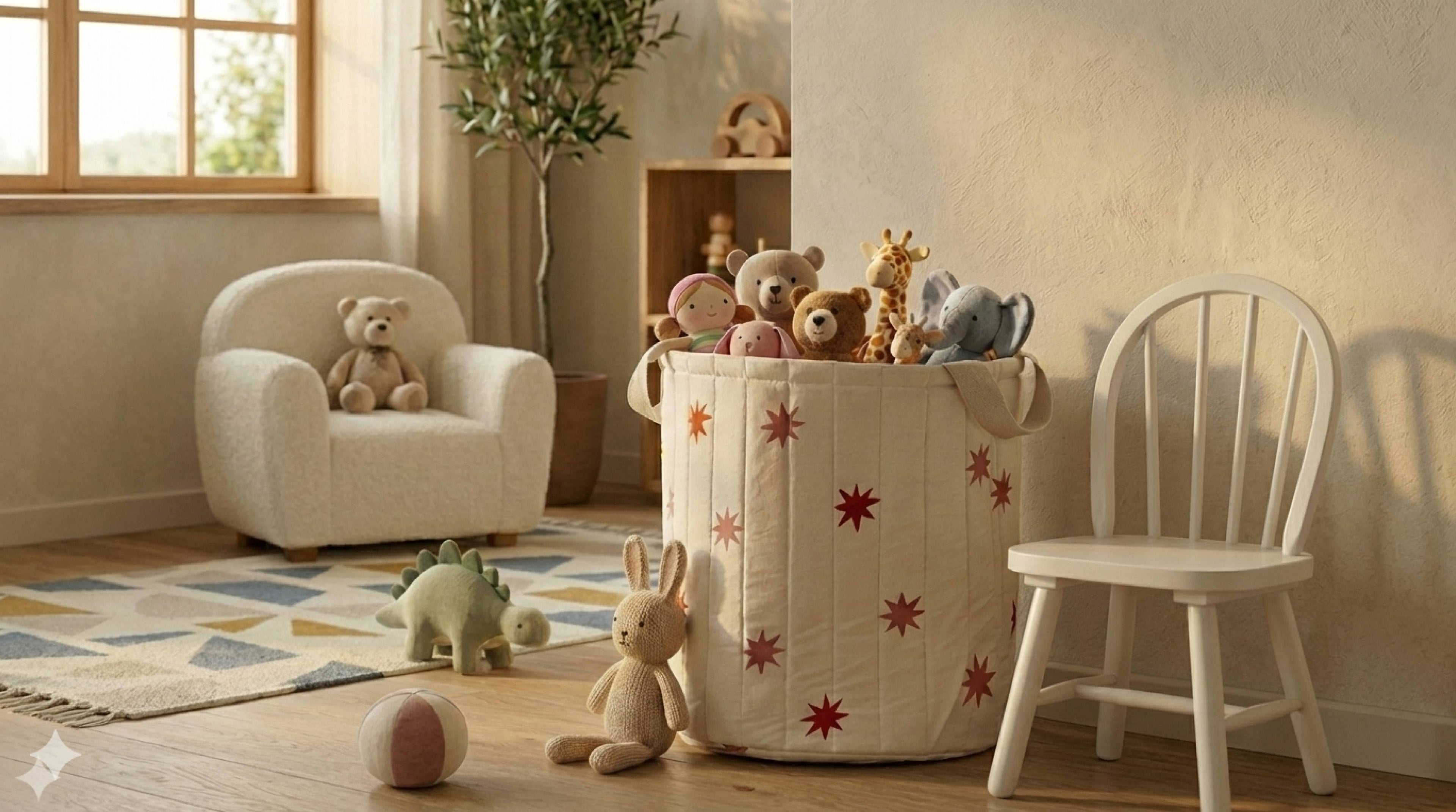 Soft cotton on the outside, water-resistant on the inside, so it handles toys, laundry and whatever else needs a temporary home. The quilted structure helps it stay upright, even when it’s not full. Big enough for the stuffed toys that never seem to belong anywhere, and easy to move when you need the floor back. One bin doing many jobs. Just how we like it.